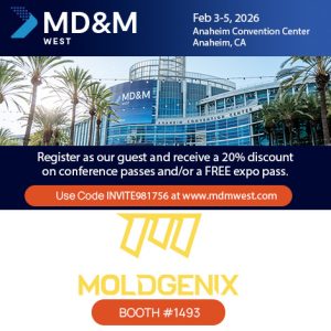 MD&M West unites five powerful industry sectors – MedTech, Automation, Design & Manufacturing, Plastics, and Packaging – creating the West Coast’s most comprehensive manufacturing event. Join Moldgenix in booth #1493 and use our promo code INVITE981756 for a 20% discount on conference passes and/or a FREE expo pass. We look forward to connecting with you!